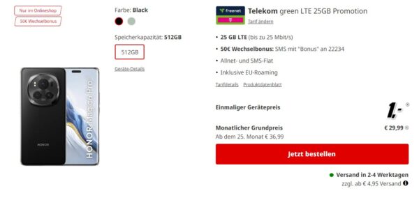 *EFF. 107€ ERSPARNIS* Honor Magic 6 Pro 5G + 25GB LTE + Alles-Flat im Telekom-Netz für 29,99€/Monat + 50€ Bonus