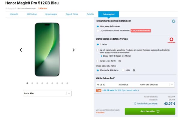*EFF. 111€ ERSPARNIS* Honor Magic 8 Pro 512GB + 45GB 5G + Alles-Flat im Vodafone-Netz für 34,99€/Monat
