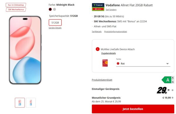 - = Rechnerische Tarifkosten von -115,30€ über 24 Monate = -4,80€/Monat für den reinen Tarif, hättet ihr euch das Gerät sowieso regulär gekauft.