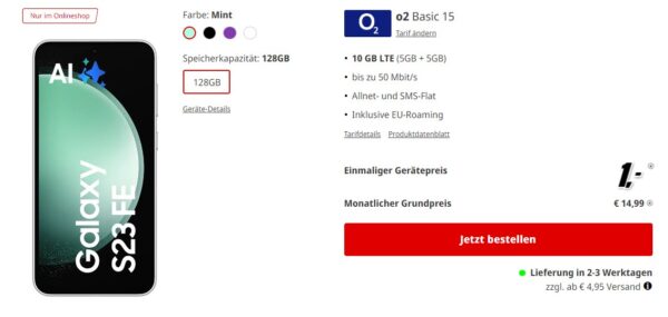 Schöner Deal für alle die das Galaxy S23 FE inkl. Tarif suchen, bei MediaMarkt bekommt ihr das Samsung Galaxy S23 FE + 10GB LTE + Alles-Flat im o2-Netz für 14,99€/Monat
