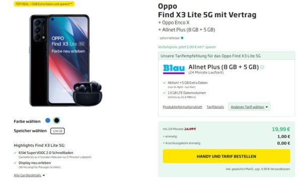 *EFF. 118€ ERSPARNIS* Oppo Find X3 Lite + Oppo Enco X + 13 GB LTE + Alles-Flat im o2-Netz für 19,99€/Monat