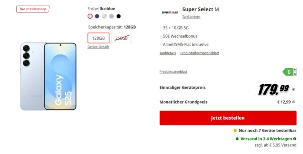 Zum Start in das Wochenende bekommt ihr bei MediaMarkt einen schönen Tarif mit dem Samsung Galaxy S25 128GB + 45GB 5G + Alles-Flat im o2-Netz für 12,99€/Monat