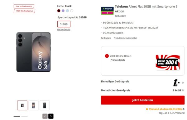 Starker Deal seitens MediaMarkt zum Wochenstart, dort bekommt ihr das Samsung Galaxy S26 512GB + 50GB 5G + Alles-Flat im Telekom-Netz für 44,99€/Monat