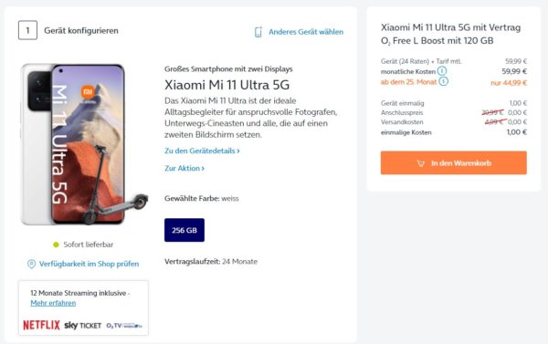 Krasses Bundle im Onlineshop von o2, dort bekommt ihr das Xiaomi Mi 11 Ultra + Xiaomi E-Scooter im o2 Free Boost mit 120GB + 1 Jahr Netflix für 59,99€/Monat