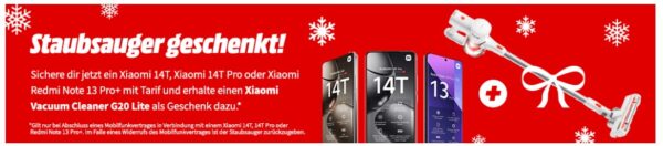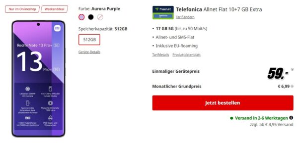 Richtig starker Deal seitens MediaMarkt, dort bekommt ihr das Xiaomi Redmi Note 13 Pro+ 5G + Staubsauger + 17GB 5G + Alles-Flat im o2-Netz für 6,99€/Monat