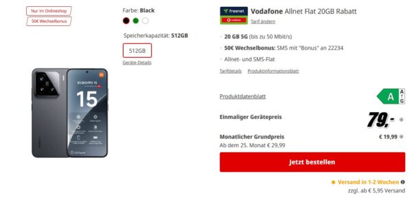 Toller Deal für die Xiaomi-Fans unter euch, bei MediaMarkt bekommt ihr das Xiaomi 15 (512GB) + 20GB 5G + Alles-Flat im Vodafone-Netz für 19,99€/Monat