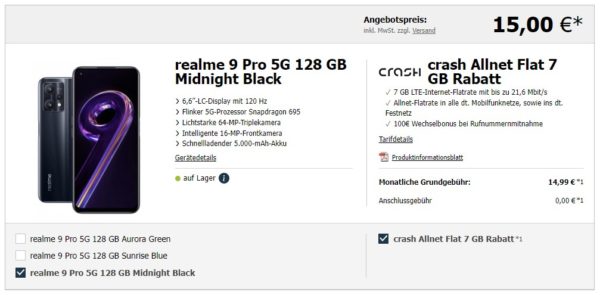 *EFF. 48€ ERSPARNIS* realme 9 Pro 5G (128GB, 49€) + 7 GB LTE + Alles-Flat im Vodafone-Netz für 14,99€/Monat