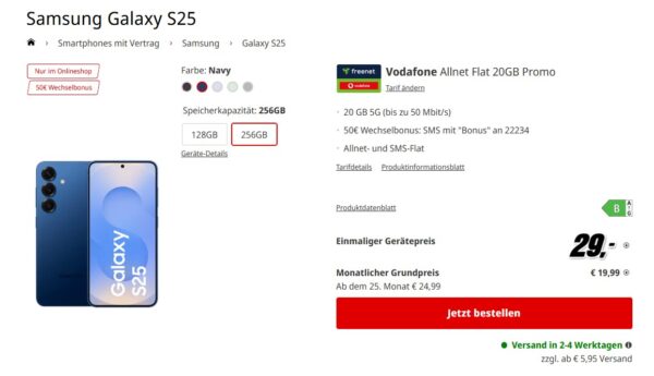 Stark! Bei MediaMarkt bekommt ihr jetzt das Samsung Galaxy S25 + 20GB 5G + Alles-Flat im Vodafone-Netz für 19,99€/Monat