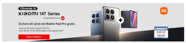 Jetzt könnt ihr euch das brandneue Xiaomi 14T im besten Netz Deutschlands sichern, bei MediaMarkt bekommt ihr das Xiaomi 14T (512GB) + Redmi Pad Pro Tablet + 15GB LTE + Telefon-Flat im Telekom-Netz für 24,99€/Monat