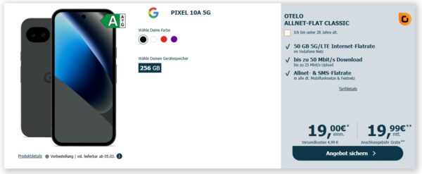 *EFF. 145€ ERSPARNIS* Google Pixel 10A 5G 256GB + 50GB 5G + Alles-Flat im Vodafone-Netz für 19,99€/Monat