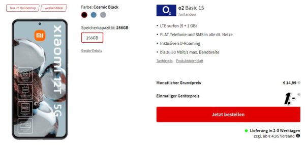 Bei MediaMarkt bekommt ihr als Weekend-Deal das Xiaomi 12T + 6 GB LTE + Alles-Flat im o2-Netz für 14,99€/Monat