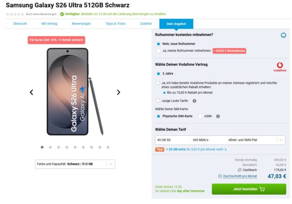 *EFF. 150€ ERSPARNIS* Samsung Galaxy S26 Ultra 512GB + 45GB 5G + Alles-Flat im Vodafone-Netz für 34,99€/Monat