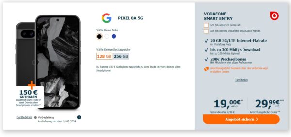 *EFF. 155€ ERSPARNIS* Google Pixel 8a + 20GB LTE + Alles-Flat im Vodafone-Netz für 29,99€/Monat + 200€ Bonus