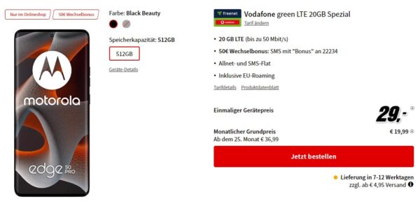 *EFF. 158€ ERSPARNIS* Motorola edge 50 pro + 20GB LTE + Alles-Flat im Vodafone-Netz für 19,99€/Monat
