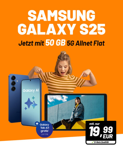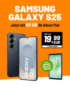 Zum Start in die Woche bekommt ihr bei klarmobil das Samsung Galaxy S25 (128GB) + Galaxy Tab 11 + 50GB 5G + Alles-Flat im VF-Netz für 19,99€/Monat