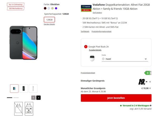 *EFF. 175€ ERSPARNIS DOPPELKARTE* Google Pixel 10 128GB + Pixel Buds 2A + 20GB 5G / 10GB 5G + Alles-Flat im Vodafone-Netz für 19,98€/Monat