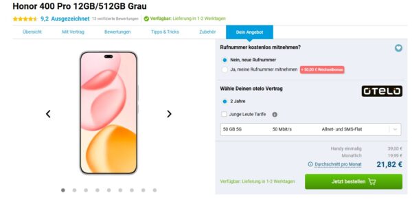 Neuer Deal von Gomibo, dort bekommt ihr das Honor 400 Pro 12GB/512GB + 50GB 5G + Alles-Flat im Vodafone-Netz für 19,99€/Monat