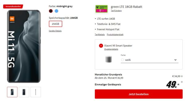 Das neue Xiaomi Mi 11 inkl. Tarif im Telekom-Netz gesucht? Bei MediaMarkt bekommt ihr das Xiaomi Mi 11 256GB inkl. Watch & Mi Box + 18GB LTE + Alles-Flat + Hotspot-Flat im Telekom-Netz für 34,99€/Monat