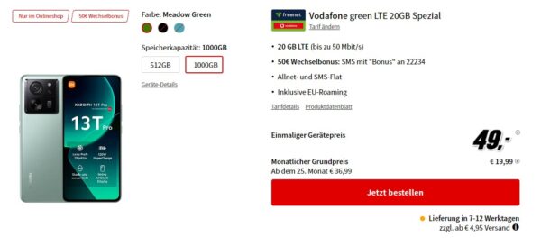 Nice! Bei MediaMarkt bekommt ihr das Xiaomi 13T Pro (1TB) + 20GB LTE + Alles-Flat im Vodafone-Netz für 19,99€/Monat + 50€ Bonus