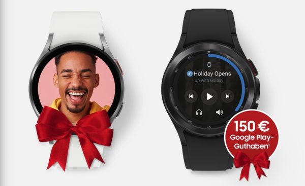- Beim Kauf einer neuen Galaxy Watch4 innerhalb des Aktionszeitraumes (01.12.2021 – 31.12.2021) erhältst Du ein Google Play-Guthaben im Wert von 150€ dazu. Nach Erwerb eines Aktionsgerätes kannst Du Dich bis spätestens 14.01.2022 hier registrieren. Weitere Details sowie alle Teilnahmebedingungen findest Du hier. Die Aktion ist nur gültig solange der Vorrat an Zugaben reicht. Die Durchführung der Aktion erfolgt nicht durch die LogiTel GmbH, sondern ausschließlich durch die Samsung Electronics GmbH, Am Kronberger Hang 6, 65824 Schwalbach/Taunus, Deutschland.