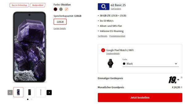 Starker Weekend-Deal seitens MediaMarkt, dort bekommt ihr das Google Pixel 8 + Pixel Watch 2 + 30GB LTE + Alles-Flat im o2-Netz für 24,99€/Monat