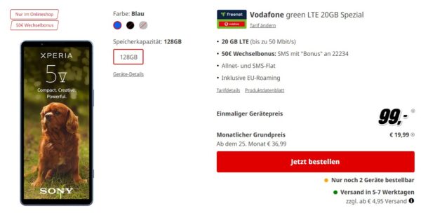Bei MediaMarkt bekommt ihr das Sony Xperia 5 V + 20GB LTE + Alles-Flat im VF-Netz für 19,99€/Monat