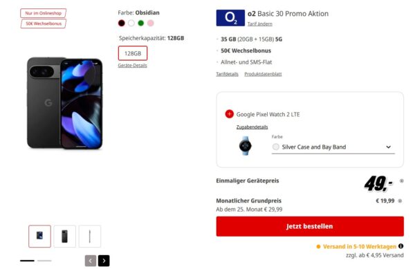 Starkes Bundle, bei MediaMarkt bekommt ihr die Google Pixel 9 + Pixel Watch 2 LTE + 35GB 5G + Alles-Flat im o2-Netz für 19,99€/Monat