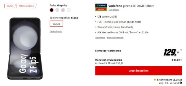 Sehr schönes Angebot von MediaMarkt mit dem neuen Flip5, dort bekommt ihr das Samsung Galaxy Z Flip5 + 20GB LTE + Alles-Flat im Vodafone-Netz für 34,99€/Monat