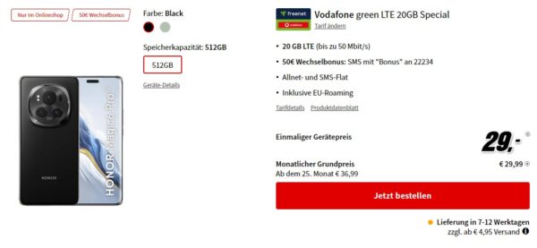 Das wichtigste zuerst hier könnt ihr euch krasse 245€ Ersparnis sichern! 🔥 Im Onlineshop von MediaMarkt bekommt ihr das Honor Magic 6 Pro 5G + 20GB LTE + Alles-Flat im VF-Netz für 29,99€/Monat