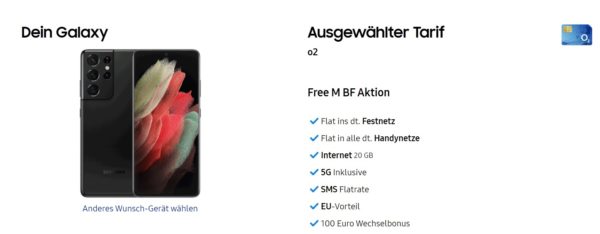 Diesmal mit dem Samsung Galaxy S21 Ultra 5G + 20GB LTE + Alles-Flat im o2-Netz für 23,99€/Monat.