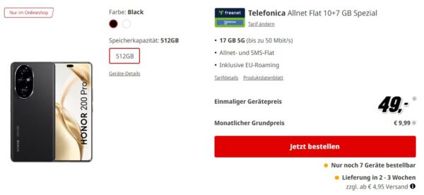 Schöner Weekend-Deal seitens MediaMarkt, dort bekommt ihr das Honor 200 Pro + 17GB LTE + Alles-Flat im o2-Netz für 9,99€/Monat