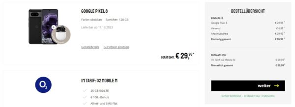 *EFF. 268€ ERSPARNIS* Google Pixel 8 + Pixel Buds Pro + 25GB LTE + Alles-Flat im o2-Netz für 29,99€/Monat