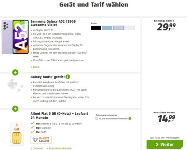 Fazit: Hier bekommt ihr das neue Samsung Galaxy A52 Zugaben im Telekom-Netz mit effektiv ~26€ Ersparnis.