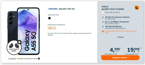 *EFF. 27€ ERSPARNIS* Samsung Galaxy A55 5G + Galaxy Buds FE + 20GB LTE + Alles-Flat im Vodafone-Netz für 19,99€/Monat