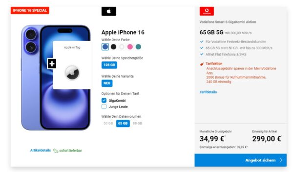 *EFF. 28€ ERSPARNIS* Apple iPhone 16 + AirTag + 65GB LTE/5G + Alles-Flat im VF-Netz für 34,99€/Monat (GigaKombi) + 200€ Bonus