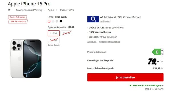 Coole Kombination mit dem iPhone 16 Pro, bei MediaMarkt bekommt ihr das Apple iPhone 16 Pro + 300GB 5G + Alles-Flat im o2-Netz für 39,99€/Monat
