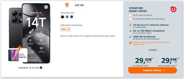 *EFF. 313€ ERSPARNIS* Xiaomi 14T 5G + Redmi Pad Pro + 20GB LTE/5G + Alles-Flat im VF-Netz für 29,99€/Monat + 200€ Bonus