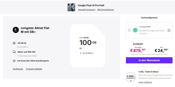 Neuer Deal von DeinHandy, dort könnt ihr euch das Google Pixel 10 Pro Fold + 100 5G + Alles-Flat im Telekom-Netz für 24€/Monat sichern