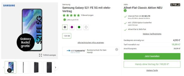 Starkes Angebot bei DeinHandy, dort bekommt ihr das Samsung Galaxy S21 FE 5G + Buds 2 + 20 GB LTE + Alles-Flat im Vodafone-Netz für 19,99€/Monat