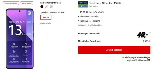 Im Onlineshop von MediaMarkt bekommt ihr das Xiaomi Redmi Note 13 Pro+ 5G + 15GB LTE + Alles-Flat im o2-Netz für 9,99€/Monat