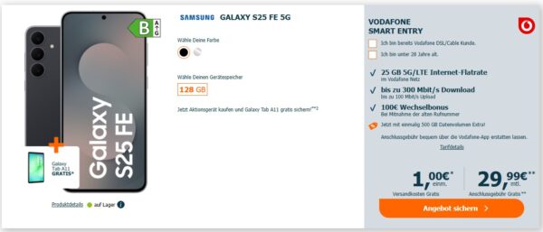 *EFF. 46€ ERSPARNIS* Samsung Galaxy S25 FE 5G + Galaxy Tab A11 + 25GB 5G + Alles-Flat im Vodafone-Netz für 29,99€/Monat (GigaKombi 24,99€/Monat)