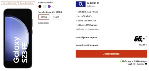 Schönes Angebot seitens MediaMarkt, dort bekommt ihr das Samsung Galaxy S23 FE + 10GB LTE + Alles-Flat im o2-Netz für 14,99€/Monat