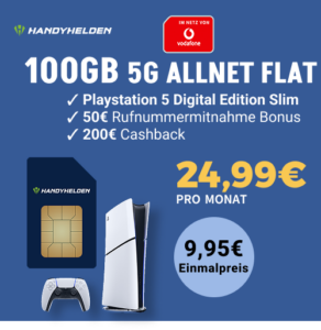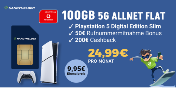 Starker Deal seitens Handyhelden, dort bekommt ihr die Playstation 5 Slim (Digital Edition) + 100GB 5G + Alles-Flat im Vodafone-Netz für 24,99€/Monat