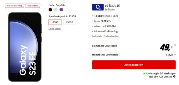 Schöner Weekend-Deal von MediaMarkt, dort bekommt ihr das Samsung Galaxy S23 FE + 10GB LTE + Alles-Flat im o2-Netz für 14,99€/Monat