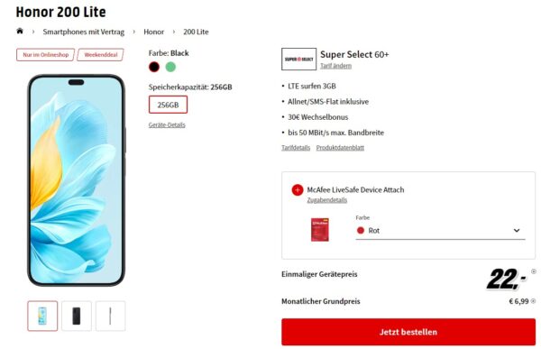 Schöner Weekend-Deal seitens MediaMarkt, dort bekommt ihr ihr das Honor 200 Lite + 3GB LTE + Alles-Flat im o2-Netz für 6,99€/Monat