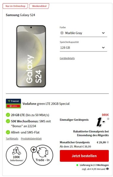 Schöner Weekend-Deal seitens MediaMarkt, dort bekommt ihr das Samsung Galaxy S24 + 20GB LTE + Alles-Flat im Vodafone-Netz für 29,99€/Monat