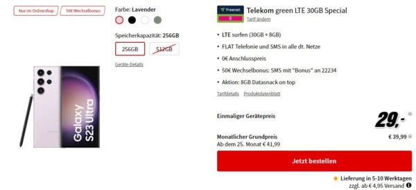 Starkes Angebot von MediaMarkt zur Black Week mit dem Galaxy S23 Ultra im Telekom-Netz, dort bekommt ihr das Samsung Galaxy S23 Ultra + 30GB LTE + Alles-Flat im Telekom-Netz für 39,99€/Monat