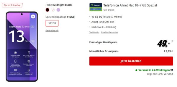 Schöner Deal seitens MediaMarkt, dort bekommt ihr das Xiaomi Redmi Note 13 Pro+ 5G + Staubsauger + 17GB 5G + Alles-Flat im o2-Netz für 9,99€/Monat
