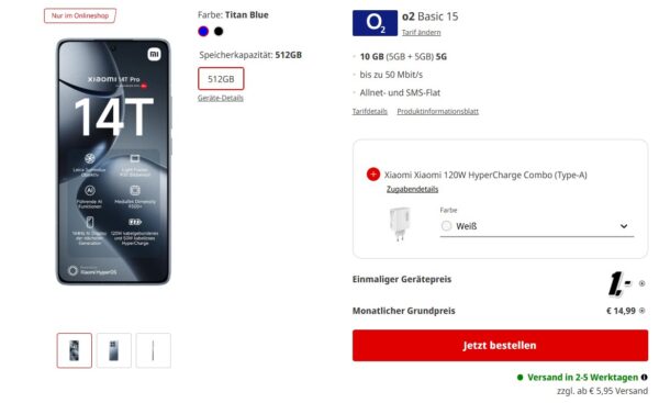 Bei MediaMarkt bekommt ihr das Xiaomi 14T Pro (512GB) + Charger + 10GB 5G + Alles-Flat im o2-Netz für 14,99€/Monat