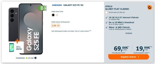 *EFF. 113€ ERSPARNIS* Samsung Galaxy S25 FE 5G + Galaxy Tab A11 + 50GB 5G + Alles-Flat im Vodafone-Netz für 19,99€/Monat